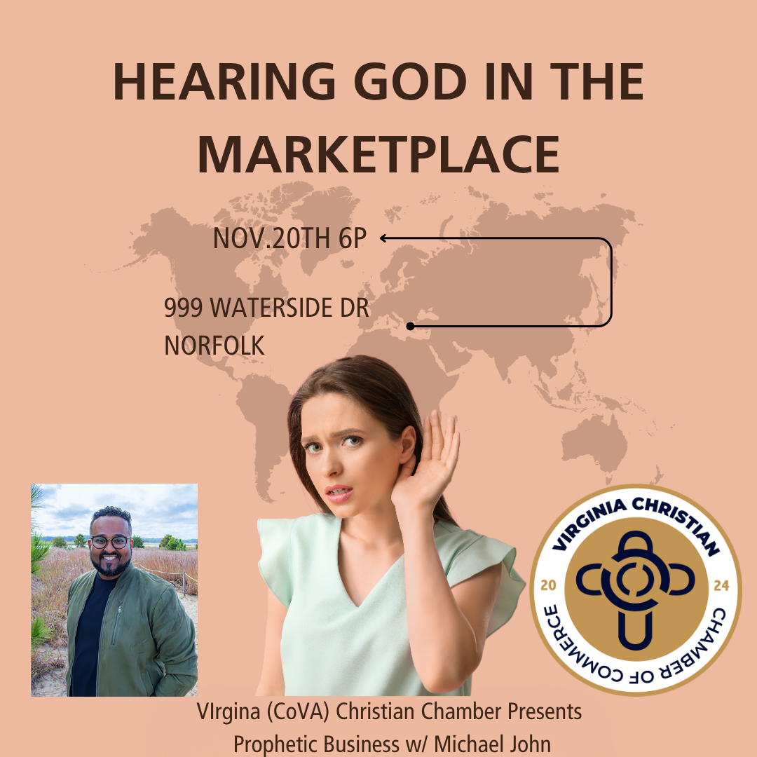 Having lived and worked around the world—from the Middle East to South Asia—Michael now calls Chesapeake, Virginia home. He holds degrees in Business Administration and a graduate degree in Divinity & Intercultural Studies from Regent University and serves on the boards of several nonprofits making a global impact. Michael and Rebecca, a Professor at Virginia Wesleyan University, have been married for 16 years and have four energetic children—Nathan, Asher, Anya, and Naomi. His heart’s desire is to see lives and nations transformed by the power of the Gospel. The CoVA Christian Chamber's Prophetic Business Training, Hearing GOD in the Marketplace MLS Q4 opens at 530pm - Start time for 6pm - Networking Heavy appetizers and refreshments - grab a notebook, clear your mind and be prepared to hear God's voice for your business!